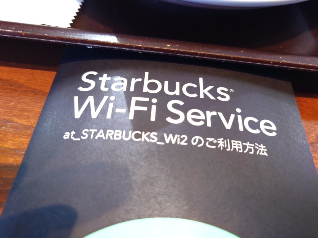 無料Wi-Fi「at_STARBUCKS_Wi2」が利用可能です。接続はSSIDを選択してブラウザでログイン(スマホでタップ)するだけなので、初めてでも迷わず使えます。