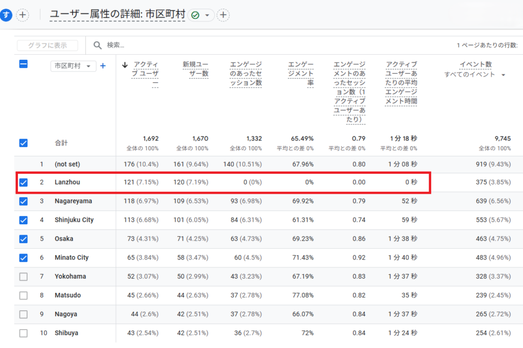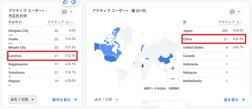 GA4の「ユーザー属性 > 市区町村」を見ていると、突然あらわれる Lanzhou(蘭州) という見慣れない都市名。日本向けのサイトを運営しているのに、中国の都市から繰り返しアクセスが記録されていると、不安になりますよね。